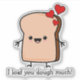 Niedliches Stück Brot mit einem bezaubernden, glücklichen Gesichtsausdruck, Armen und drei Herzen in roter Liebe, die von der Spitze seines Slice-Kopfes schweben. Unten in schwarzem Text sind die Worte, die ich lahm dich zu Teig viel! kawaii Essen mit einem niedlichen Pun.