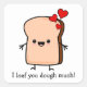 Niedliches Stück Brot mit einem bezaubernden, glücklichen Gesichtsausdruck, Armen und drei Herzen in roter Liebe, die von der Spitze seines Slice-Kopfes schweben. Unten in schwarzem Text sind die Worte, die ich lahm dich zu Teig viel! kawaii Essen mit einem niedlichen Pun.
