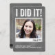 Mit dieser modernen Einladung oder Ankündigung von PiPo Press laden Sie Ihre Familie und Freunde zur Abschlussfeier Ihres Liebsten ein. Ein kühnes "I DID IT" in neutralem Chalkboard-Grau mit einer Foto-Öffnung sagt jedem, wie stolz man auf seinen Absolvent ist. Ideal für eine Party Einladung oder einen Abschluss, der von der Highschool, der Universität oder dem Graduiertenstudio angekündigt wird. Passen Sie mit dem Namen Ihrer Schule in verschiedenen Farben an und diese Einladung ist bereit zu gehen!