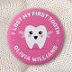 Abzeichen mit einer kleinen Zahnfee auf einem heißen rosa Hintergrund und dem Text "I lost my first zahny" und dem anpassbaren Namen unten.