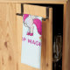Ein Küchentuch mit einem lustigen Sprichwort: Ich kackte Magie. Mit weißem Flügeldrachen mit rosa Mane, Schwanz und Hufen. Das Horn hat Ringe in Regenbogenfarbe und sieht aus wie ein lollipop mit Süßigkeiten. Dieses niedliche Einhorn zieht sich auf den Hinterbeinen auf. Das süße rosa Herz auf der Wange und die langen gürteligen Wimpern. Ein Regenbogen neben dem Wort Magie.