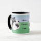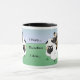 Titel liest, "ich in Herden leben… Deshalb bin kennzeichne ich…" und einen Tri Farbeglatten Collien, der durch seine Menge der Schafe umgeben wird. Die Rückseite der Tasse hat auch eine Spiegelbildansicht von, was auf der Front erscheint und das hintere Ende des glatten Collien und seiner Schafe zeigt.