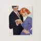 Künstler:Joe DeMers | Mann, der die Hand einer Frau in einem lila Anzug mit rotem Haar hält