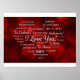 "I Liebe you" in verschiedenen Sprachen, in Herzform, in weißen Buchstaben auf rotem Hintergrund, in Weiß