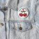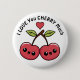 Adorables Abzeichen, Button, mit niedlichem Cartoon, kawaii fröhliche Rothirschen mit süßesten Lächeln, große runde Augen und grüne Blätter auf einem braunen Stiel. Über den Kirschen schwimmt ein kleines Herz in roter Liebe. In einem lustigen schwarzen Schriftart, der über den Kirschen gekrümmt ist, sind die Worte "I Liebe You Cherry Much". Dies ist eine Vorlage, die verlassen werden kann, wie sie ist, oder die Wörter durch einen eigenen Text ersetzen.