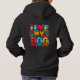 Das Design des T - Shirt enthält den Satz "I Liebe My Dog" in fett gedruckter, spielerischer Typografie. Das Wort "Liebe" wird durch ein großes rotes Herz repräsentiert und verleiht dem Wort einen lebendigen Pop. Um den Text herum sind niedlich, Pfotenabdrücke und kleine Hundeabbildungen wie Knochen und ein Hundehalsband. Das Design ist schlicht, gemütlich und perfekt, um die Zuneigung eines Hundebesitzers in einem lässigen und unterhaltsamen Stil auszudrücken.