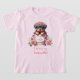 Ein Rottweiler-Welpe in einem Pagel mit Rose und Liebe "I LIEBE my Rottweiler" in rosa auf einem T - Shirt eines Mädchens