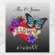 Personalisierte Hübsch romantische Weinetiketten für einen Valentinstag, Hochzeit, Geburtstag oder Geburtstag. Tattoo Stil Graffiti Text und Herz in violetten Blumen und ein blauer Schmetterling verpackt.