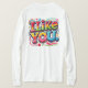 Das Design des T - Shirt "I Like You" zeichnet sich durch spielerische, handgezeichnet Typografie mit einem lustigen, freundlichen Ambiente aus. Der Text ist in einem lässigen, fließenden Stil angeordnet, der mit kräftigen, lebendigen Farben gestaltet ist, die das Auge erfassen. Um die Worte herum können fröhliche Doodles wie Herz, Sterne oder Smiley zerstreut werden, was dem Design eine positive, positive Energie verleiht. Das Gesamtbild ist lichtdurchflutet und einladend und eignet sich hervorragend, um Zuneigung niedlich und stilvoll auszudrücken.