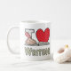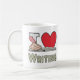 I Liebe Writing zeigt die Hand eines Schriftstellers mit einem Quill-Stift, der in einem Notizbuch geschrieben ist, mit einem I-Liebe-Symbol dahinter. Teilen Sie Ihre Liebe des Schreibens!