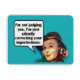 Die lustige Retrofrau sagt: "Ich beurteile dich nicht, ich korrigiere einfach schweigend deine Unvollkommenheiten." Ein cleveres und witziges Sprichwort von einer Vierzigerfrau mit einem stilvollen Hut und einem roten Lippenstift. Funny für Freunde und Fake Freunde.