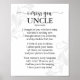 "Ich vermisse dich" Gedicht: "Ich habe heute mit Liebe an dich gedacht, aber das ist nichts Neues. Ich habe gestern und auch Tage davor an dich gedacht. Ich denke schweigend an dich. Ich spreche oft deinen Namen. Alles, was ich habe, sind Erinnerungen und Ihr Bild in einem Rahmen. Dein Gedächtnis ist mein Sake, mit dem ich nie etwas machen werde. Gott hat dich in seinem behalt, ich habe dich in meinem Herzen." Ideal, um sich an einen geliebten Onkel zu erinnern.