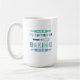 A cute coffee mug for the baker in your life with "I'd rather be baking" in a fun retro font with illustrations of rolling pins and a whisk in blue.