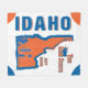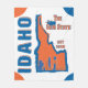 Die Idaho-Ausrüstungsbeschreibungen eine Illustration eines Kartoffelsack-Cartooncharakters, der heraus an der Typografie liest Idahos Spitznamen, "den Edelstein-Staat", eine Silhouette des Skyline von Boise und Idahos Statehood Jahr hängt.