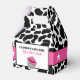 Feiern Sie Braut mit diesen Disco Cowgirl-Junggeselinnen-Abschied Gefallen-Schachteln. Sie sind mit einem lustigen Schwarz-Weiß-Kuh-Druck versehen und zeigen eine Diskokugel mit einem rosa Cowboyhut. Der Text kann mit Ihrer eigenen Nachricht angepasst werden.