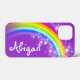 Hübscher Regenbogen mit lila Himmel Design Mädchen iPhone Gehäuse. Personalisieren Sie mit Ihrem Kinder eigenen Namen, perfekt für eine einfache Geräteidentifizierung. Dieses Beispiel liest derzeit Abigail. Exklusiv von Sarah Trett entworfen und illustriert. www.mylittleeden.com