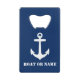 Ihr Personalisierter Name oder Bootname mit einem Custom Nautical Anchor in Weiß auf einem stilvollen Navy Blue, Bar Key Bottle Opener.