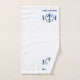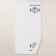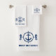Ein wunderschönes personalisiertes Badetuch-Set mit Ihrem Familiennamen oder Bootsnamen. Mit einem speziell für den nautischen Anker und Seepferd konzipierten Emblem in Marineblau auf weiß oder ändern Sie einfach die Hintergrundfarbe zu Ihrem aktuellen Dekor. Die perfekte Ergänzung zu Ihrem Zuhause, Strandhaus oder Ferienhaus.