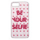 inspirierendes Zitat "be your selfie" auf pastellrosa mit rotem Herz Hintergrund