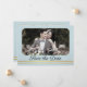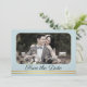 Elegante, staubblaue Save the Date-Karte mit einem eigenen Foto auf der einen Seite und einem Bild einer Berglandschaft mit goldenen Streifen auf der anderen Seite.