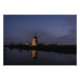 Foto von beleuchteten historischen Windmühlen mit Reflektion im Wasser des Flusses während der Blauen Stunde am Anfang der Nacht in Kinderdijk in den Niederlanden.