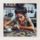 Eine niedliche Abbildung einer Frau mit dunklem Haar in einem unordentlichen Knäuel, die an ihrem Küchentisch sitzt und ein Puzzle mit Puzzle macht.