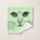 Ce linge a une illustration d'un visage de chat noir avec des murmures et des yeux jaune vif sur un arrière - plan vert clair.