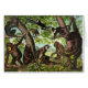 Illustration vintage comportant une série de singes et singes comprenant un gorille dans une scène de jungle où certaines sont dans les arbres tandis que d'autres sont au sol. La carte est intérieur vide pour votre propre message.