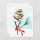 Retten Sie Geld dieses Jahr, indem Sie Familienpostkarten senden; Sie retten auf den Karten selbst, den benötigten Portokosten und keinen Umschlägen. Ein illustrierter Kiefernkegel mit festlichem rotem Band und grüne Kiefernnadeln mit Watercolorbeschaffenheit. Ursprüngliche Illustration durch Becky Nimoy. Teil einer größeren Feiertagssammlung mit mehr Kartenarten verfügbar.