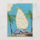 Illustrierte Landkarte von Sri Lanka (mit den umliegenden Inseln) in einem Vintagen, detaillierten Stil, mit einem alten Automobil dekoriert.