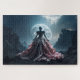 Eine geheimnisvolle Figur in einem aufwändigen Gewand steht vor einem glühenden Vollmond, Set gegen eine dramatische Felslandschaft. Die Szene wird durch den Kontrast zwischen den komplizierten Details des Kleides und dem rauen Gelände verstärkt.