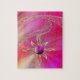 Ein brillanter Fraktal-Fluss aus blassgelb und orange, der sich in heiß rosa verwandelt, überlagert mit goldfarbenem Sonnenmotiv-Filigree, bestickt mit Juwelen und mit einem glatten, tiefrosa Edelstein, umgeben von strahlenden goldenen Sonnenstrahlen.