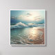 Cette image capture la scène sereine mais puissante de vagues se brisant sur une plage au coucher du soleil. L'accent principal est mis sur la vague qui s'écrase au centre, qui explose en une explosion de spray blanc éclatant contre les tons plus doux de la mer. L'eau présente un beau dégradé de couleur, passant du turquoise profond à un bleu clair et translucide près du rivage. Le sable humide au premier plan reflète la lumière dorée et chaude du soleil couchant, créant un sentier chatoyant qui mène l'oeil vers l'horizon. Le ciel est rempli d'un jeu dramatique de lumière et d'ombre, avec des nuages sombres à gauche qui contrastent avec les nuages brillants baisés de soleil à droite. Cette composition combine le mouvement dynamique des vagues avec la lumière paisible du coucher du soleil, créant une atmosphère captivante et tranquille.