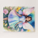 Jigsaw puzzle d'une jeune fille avec des ailes de fées debout au milieu d'un jardin animé rempli de fleurs colorées et de papillons. Sa robe marie les tons pastel, rehaussant l'atmosphère magique et capricieuse de la scène.