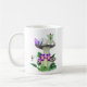 Mug avec une petite fée aux ailes vertes assis au-dessus d'un grand champignon tacheté, accompagné d'un papillon violet. Ci-dessous, des fleurs violettes vibrantes et des feuilles verdoyants ajoutent de la couleur à la scène fantaisiste.