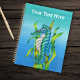 Ce planificateur a un cheval de mer imaginaire avec des cornes de dragon, le ventre blanc et des nageoires bleutées vertes avec sa queue enroulée autour des algues sur un arrière - plan fait dans différentes nuances de verts bleus. Customisez votre texte sur le devant avec le modèle.