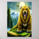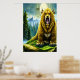 Grand ours sabertooth doré imaginaire aux yeux effrayants et aux dents pointues assis dans la forêt. C'est un art généré par l'IA.