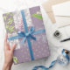 Eine Rolle des stilvollen Verpackungs-Papiers mit einem Imitat-Patchworkmuster in der Kunst Nouveau Art, mit Lilie-Von-d Valley auf einem malvenfarbenen Hintergrund; von der Posh u. Painterly "für die Liebe der Lilien" Sammlung.
