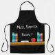 Eine Schürze, die für Lehrer mit Imitat-Chalkboard-Hintergrund , ein paar Bücher , ein roter Apfel und eine Kreide konzipiert ist. Personalisieren Sie es mit dem Namen und der Zimmernummer des Lehrers.