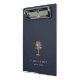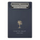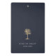 Chic personalisierte Zwischenablage bietet zwei Textzeilen in klassisch weißer Schrift, auf marineblarem Hintergrund mit einer tropischen Palmenbildermalerei in Imitaten mit Goldfolie. Design wiederholt sich auf der Rückseite. Bitte beachten Sie, dass diese Zwischenablage eine Mini-Größe hat; Vollversion ist auch in unserer Gold Palm Tree Kollektion erhältlich.