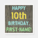 Dieses lustige Geburtstagsparty-Design enthält eine Nachricht wie "HAPPY 10 th BIRTHDAY, FIRST-NAME!", in der der Name personalisiert sein kann. Der Hintergrund ist mit einem rustikalen, braunen Holzkornmuster aus Imitat gestaltet. Der personalisierte Nachrichtentext weist Farben wie Blau, Gelb und Grün auf und hat ein Aussehen, das durch das Anbringen von gestrichenen, gestrichelten Buchstaben inspiriert wird. Napkins wie diese könnten vielleicht auf einer Geburtstagsparty für jemanden verwendet werden, der gerade seinen zehnten Geburtstag feiert. [~Z0000292]