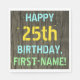 Dieses lustige Geburtstagsparty-Design enthält eine Nachricht wie "HAPPY 25 th BIRTHDAY, FIRST-NAME!", in der der Name personalisiert sein kann. Der Hintergrund ist mit einem rustikalen, braunen Holzkornmuster aus Imitat gestaltet. Der personalisierte Nachrichtentext weist Farben wie Blau, Gelb und Grün auf und hat ein Aussehen, das durch das Anbringen von gestrichenen, gestrichelten Buchstaben inspiriert wird. Napkins wie diese könnten vielleicht auf einer Geburtstagsparty für jemanden verwendet werden, der seinen fünfundzwanzigsten Geburtstag feiert. [~Z0000292]