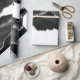 Agate sind Steine aus mikroskopischen Quarzkristallen, die sich in Bändern ausbreiten, ähnlich diesem Design, wo grau, weiß und schwarz dominieren, mit silberfarbenen Glitzer und Glitzern. "Kein wirklicher Funkeln, Marmor oder Agar; es ist ein simulierter Effekt."