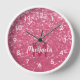 Monogramm Wanduhr Persönlich mit Ihrem individuelle Name. Schöne mädchenhaft glamouröse sanfte leichte pinkfarbene, purpurrote glänzende Glitzer Glitzern trendige moderne Farbe. Foto von magenta Glitzern Glitzer! Farbe des Jahres in Imitaten Glitzern!