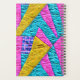 Imitate patchwork quilt inspiriert rosa, gelb und blau auf der Vorder- und Rückseite mit dem Namen in grauem Rechteck vorne.
