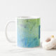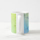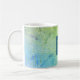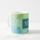 Diese Kaffee-Tasse bietet ein elegantes Design in aquamarin und grün und ist mit geometrischen Linien von hellgrünen Imitate Glitzer betont. Eine dunkle aquamarine Box in der Mitte bietet ein individuelles Monogramm.