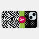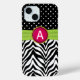 © Sozialite Designs. Unser Girly and Fun Band und Juwel-Look, mit zebra print und polka-dot muster Hintergrund, hat ein Monogramm, um diese iPhone-Hülle zu personalisieren. Das Band ist grün und das Juwel ist rosa mit Gold.