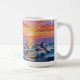An ai impasto style dolphins swimming with a pink, orange and purple sunset over the ocean . A beautiful coastal coffee cup to add a beachy touch to your drinkware.