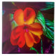 Diese 6" Keramik Tile zeigt ein Originalfoto von ZoeSPEAK von einer roten Orangen Ungeduldigen Blume. Das Sonnenlicht verleiht den Blütenblättern gelbe Lichter und hellt die grünen Blätter auf, wodurch die lila Schatten der unten stehenden Blätter einen knackigen Rand bilden.