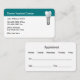 Cartes de visite de rendez-vous Dental moderne conçus avec un implant dentaire graphique et une belle bannière turquoise qui mettent en vedette votre nom d'entreprise avec la possibilité de remplacer le graphique par votre propre logo dentaire créé pour une entreprise Dentiste, Orthodontiste, Dentistère et a un modèle de rendez-vous sur le dos.